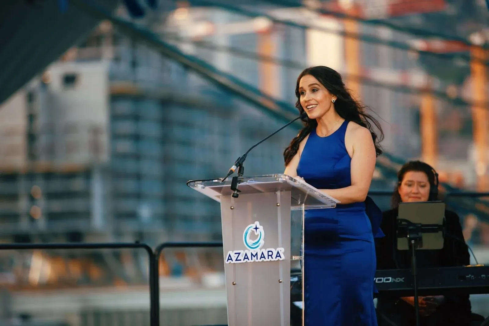 Beth christening the Azamara Onward vessel in Monte Carlo, Monaco, in 2022, as the ship's Godmother. Image courtesy Beth Santos